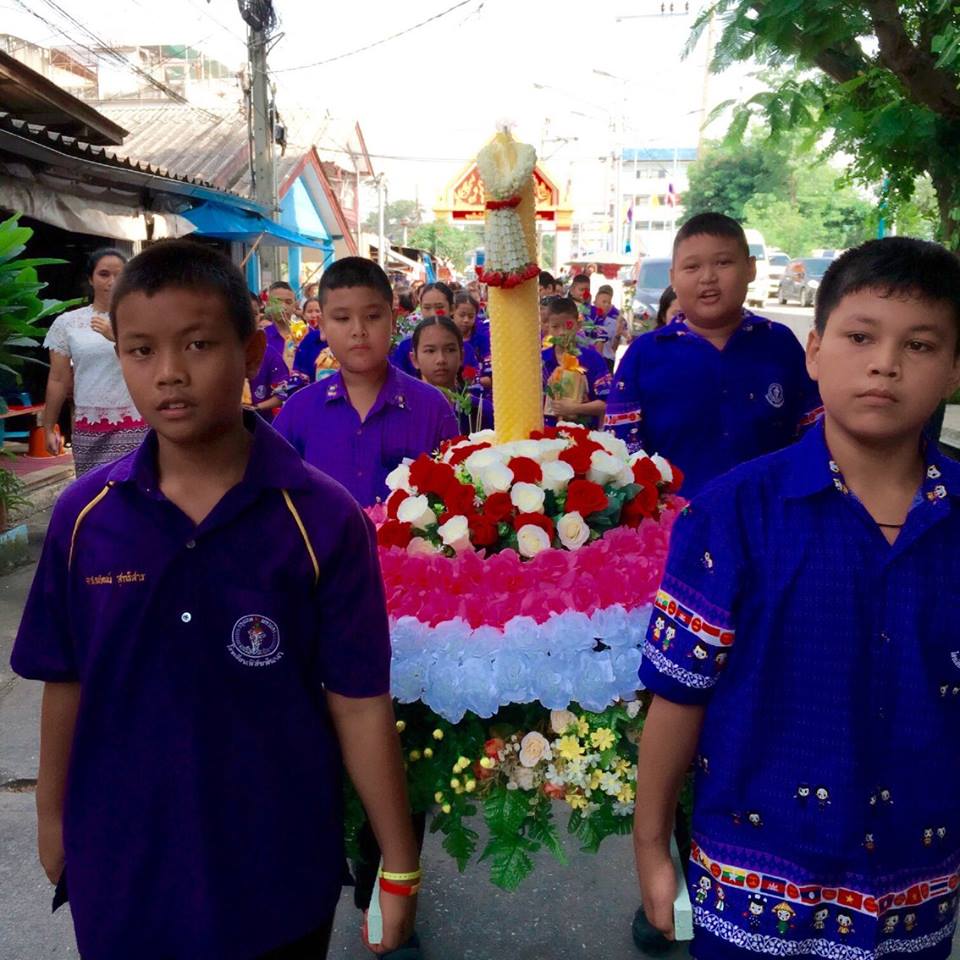 | ผู้บริหาร คณะครู และนักเรียนร่วมกิจกรรมประเพณีแห่เทียนพรรษา เนื่องในวันเข้าพรรษา เพื่อเป็นการจรรโลงพระพุทธศาสนา ส่งเสริมวัฒนธรรมประเพณีไทยให้เยาวชนปฏิบัติตามแนวทางพระพุทธศาสนาได้อย่างถูกต้อง |